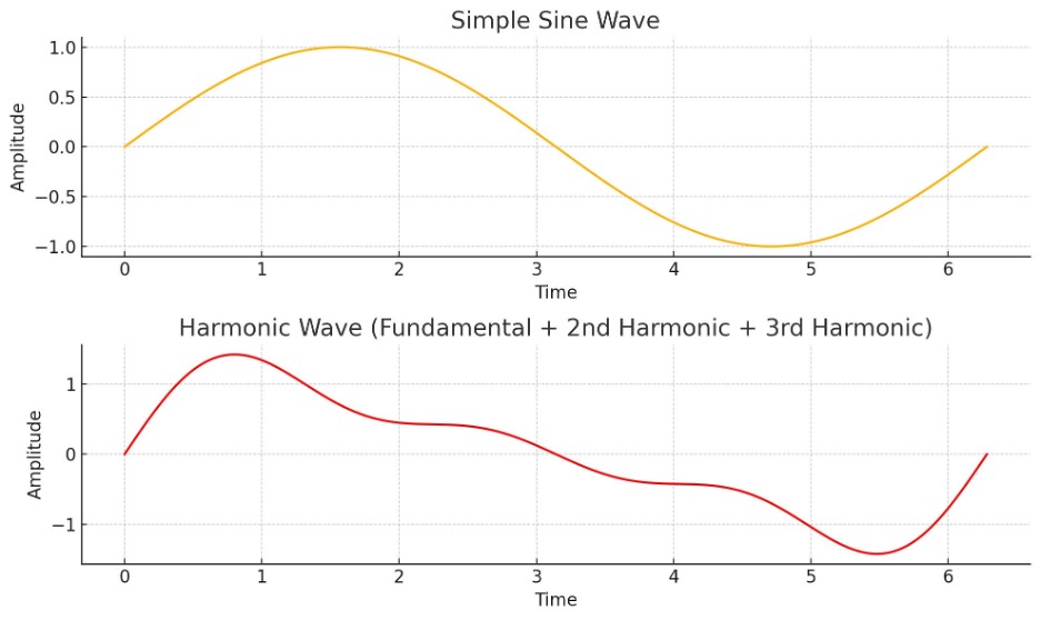 در تصویر فوق، موج بالایی یک موج سینوسی ساده و موج پایینی یک موج هارمونیک است که شامل ترکیبی از موج سینوسی پایه (موج اصلی) به همراه هارمونیک دوم و سوم میباشد. موج هارمونیک به دلیل اضافه شدن فرکانسهای بالاتر، شکل پیچیدهتری نسبت به موج سینوسی ساده دارد.